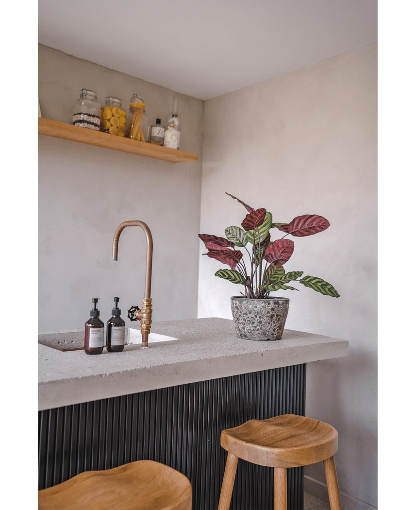 Suchen Sie nach einer stilvollen und pflegeleichten Ergänzung für Ihr Zuhause oder Büro? Die Kunstpflanze Calathea Makoyana in einem eleganten Rotton ist die perfekte Wahl, um jedem Raum Leben einzuhauchen.