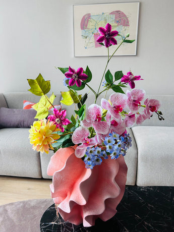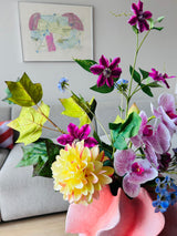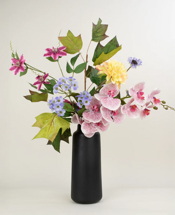 Das tief gefärbte Clematis -Doppel und die satte Orchidee echte Berührung in Fuchsia und Lila bieten einen auffälligen Farbkontrast, während die Dahlia Real Touch in Champagner ein weiches, leuchtendes Gegenstück ist. Das großzügige Tulpenblatt und die Farnzweige bringen die natürliche Tiefe und Struktur in den Blumenstrauß und stärken den gartenähnlichen Charakter.