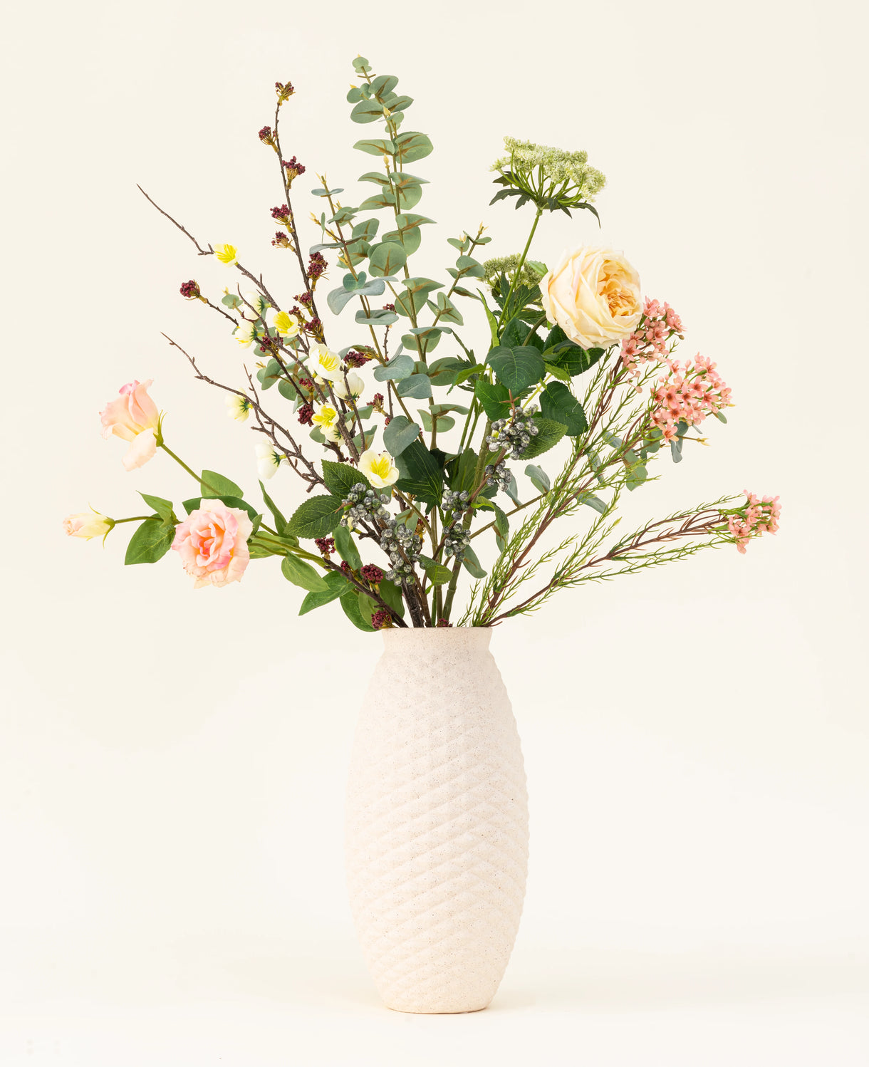 Die Blush Blossom enthält eine ausgewogene Mischung aus: Garden Rose "Anniken" Real Touch, Eustoma Real Touch, Callicarpa, Wachsblume, Kantbloem, Prunus, Beeren und Eukalyptus.