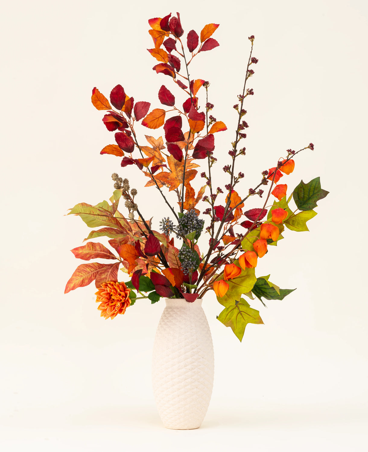 Chestnut Charm erweckt die reichen Farben und Texturen des Herbstes in einem stilvollen Seidenstrauß zum Leben. Mit tiefen roten und orangefarbenen Tönen, robusten Blättern und verspielten Beerenstrukturen ruft dieses Arrangement das Gefühl eines Waldspaziergangs in der Oktobersonne hervor. Ein kraftvolles, aber raffiniertes Stück, das jedem Raum Wärme und Charakter verleiht, ohne zu dominieren.