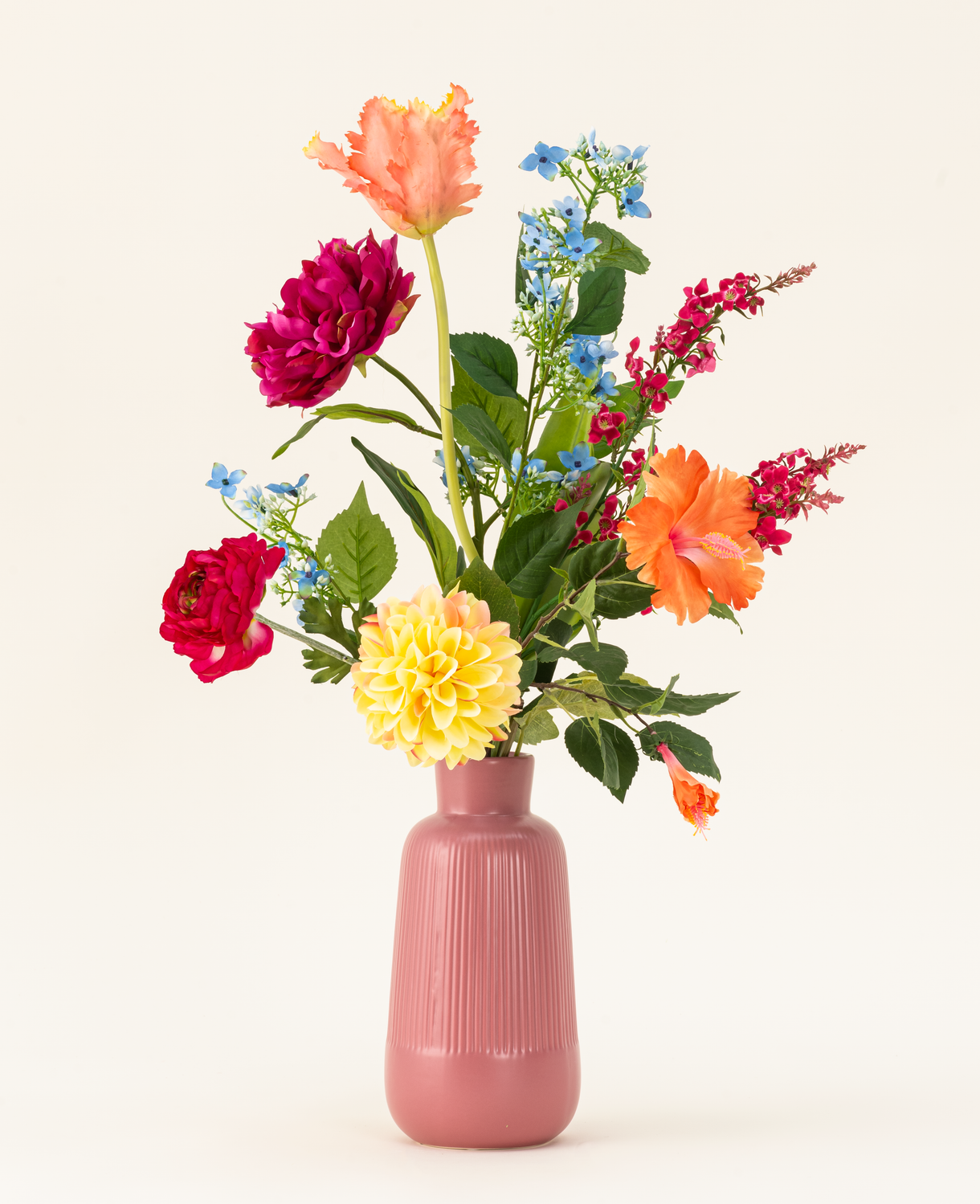 Entdecken Sie die zeitlose Schönheit des Konfetti Bloom Bouquet, eine exklusive Komposition hochwertiger Seitenblumen, die Ihr Interieur aufhellen. Dieses Seidenstrauß kombiniert Eleganz und Bequemlichkeit und besteht aus einer funkelnden Mischung aus Dahlia Real Touch, Catnip, Ranunculus, Hibiskus, französischem Sichtwert Tulp, Pfingstrosen und wilder Hortensien.