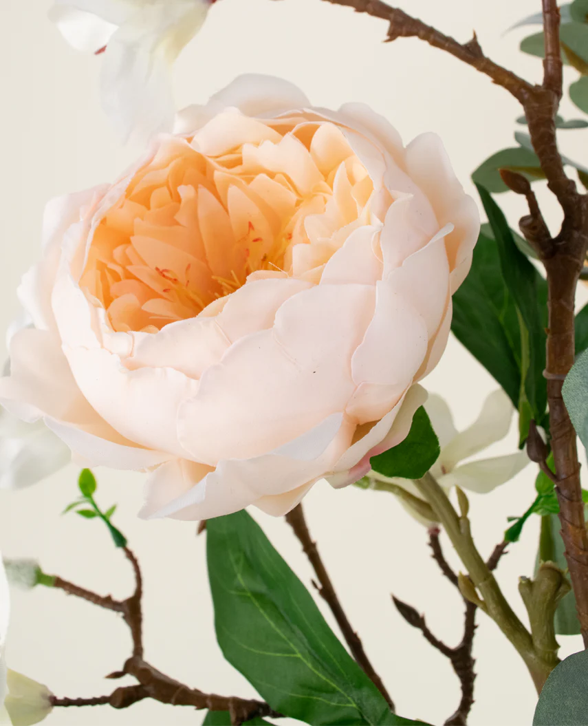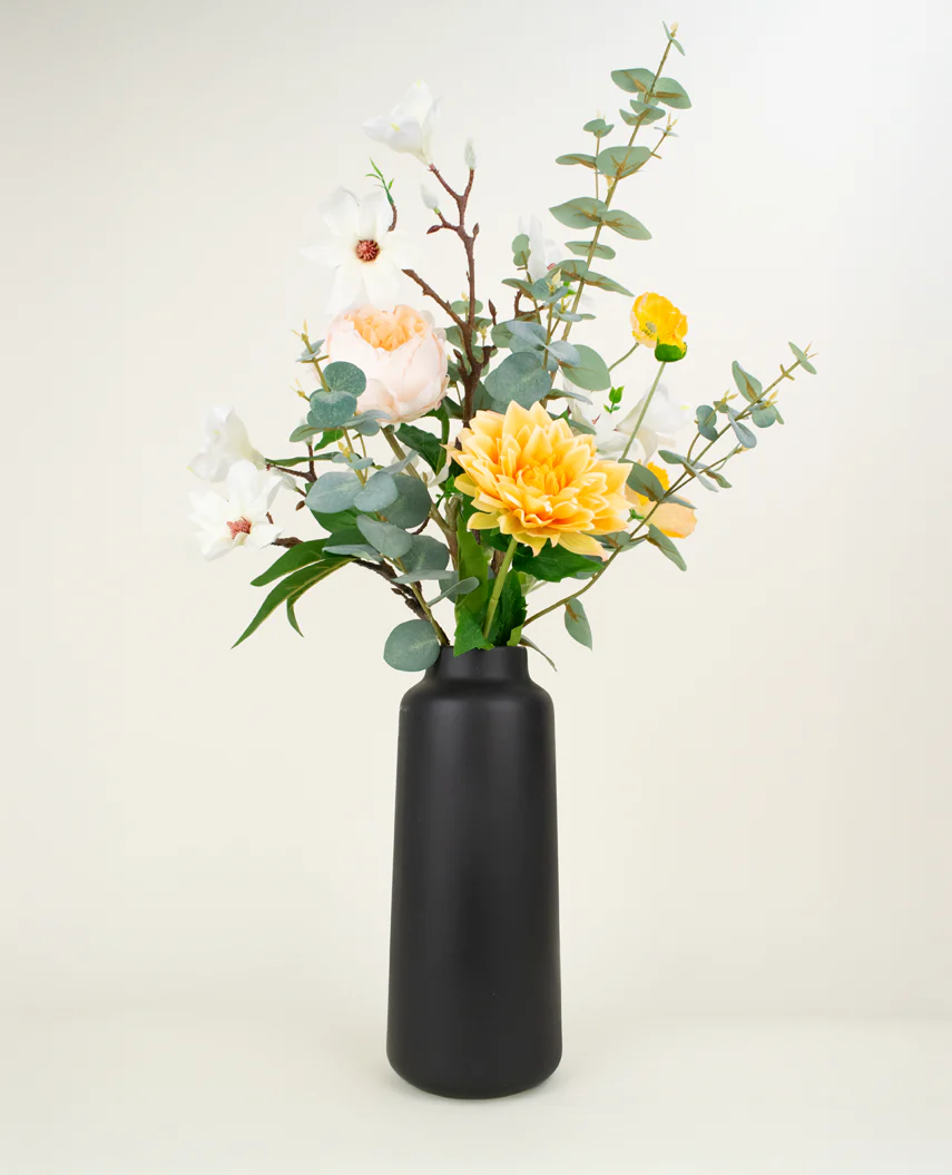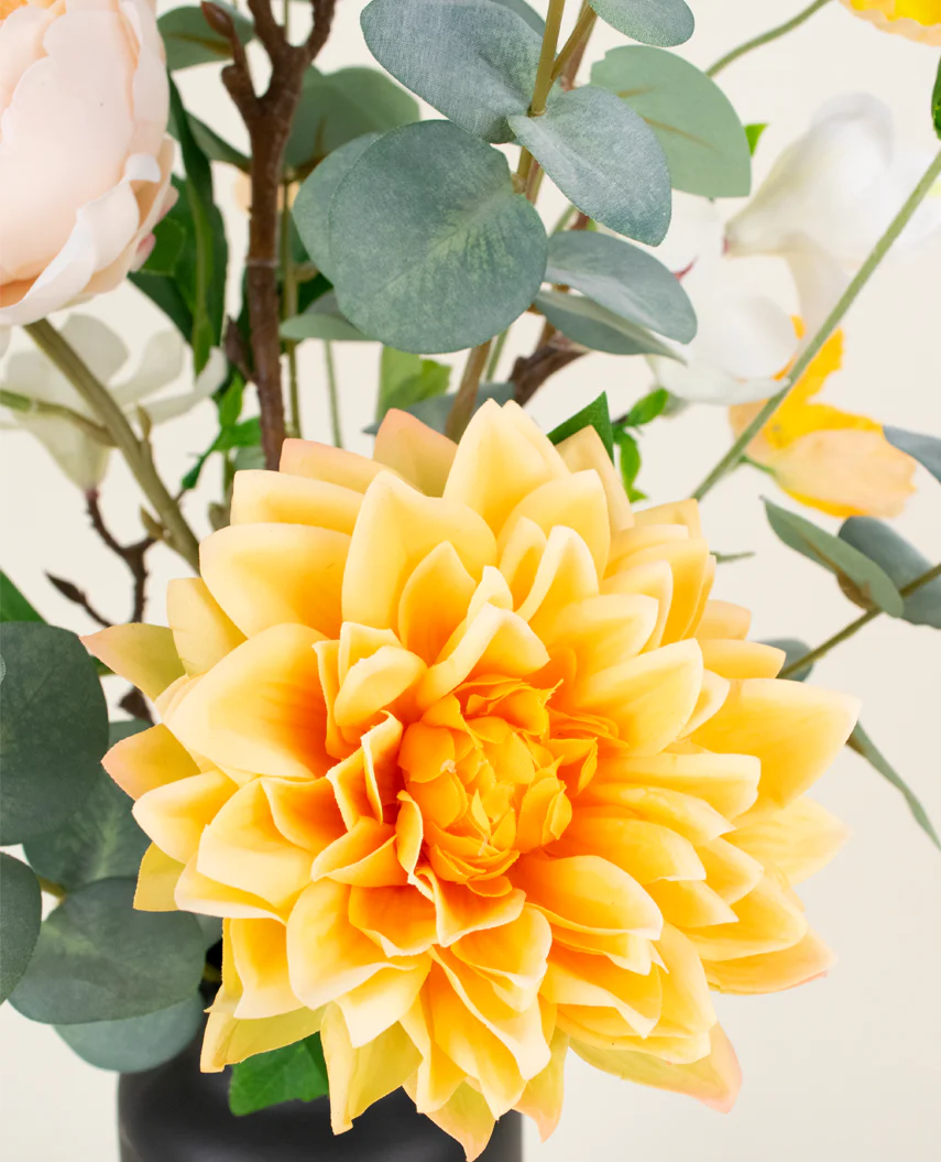 In diesem Blumenstrauß kommen die warmen Farbtöne der gelben Dahlien wunderschön mit dem tiefen Purpur der Lotus -Pfingstrose zusammen. Eine klassische Pfingstrose, luftige weiße Magnolien und großzügige Eukalyptus -Zweige sorgen für Gleichgewicht, Textur und Ruhe im Ganzen.