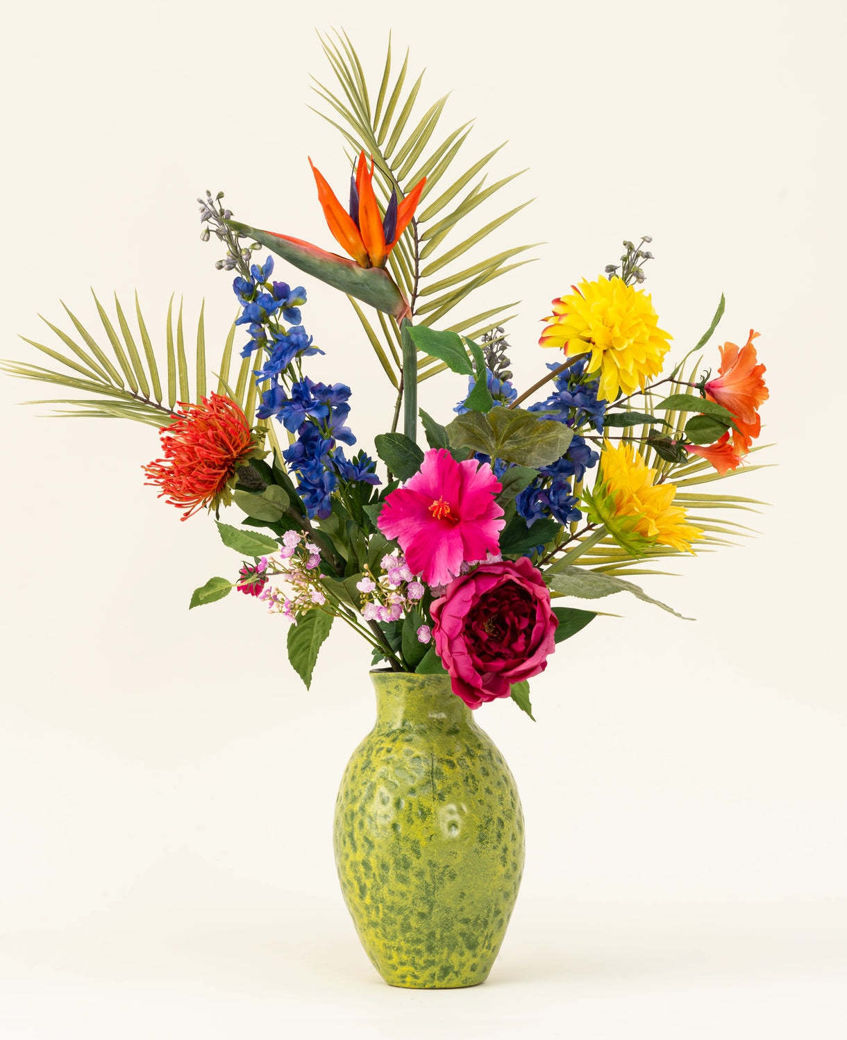 🌺 Exotisch, ausdrucksstark und funkelnd - Hibiskusfiesta ist eine Explosion von Farbe und Charakter. Dieses Seidenstrauß bringt die Energie einer tropischen Party direkt in Ihr Innenraum. Der feurige Hibiskus in Orange und Rosa bildet das Herz des Blumenstraußes und voller Fröhlichkeit und Flair.