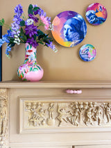Die üppige Wisteria und Bewerragen bieten eine anmutig fallende Basis, während die Clematis groß in Lila und das elegante Nerin in rosa Höhe und Farbkontrast bieten. Der Green Bay -Zweig fügt natürliche Frische hinzu und bringt sie in das Gleichgewicht.