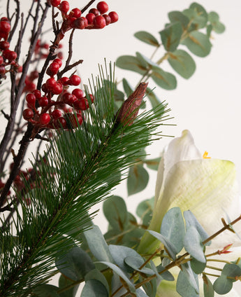 Der weiße Amaryllis bildet den ruhigen Mittelpunkt und verleiht dem Blumenstrauß ein reines, elegantes Aussehen. Die roten Beeren fügen eine festliche und lebhafte Note hinzu, während der Kiefernzweig die natürliche Tiefe und eine robuste Basis sorgt. Der Eukalyptus vervollständigt das Ganze mit Frische und einer modernen grünen Berührung.