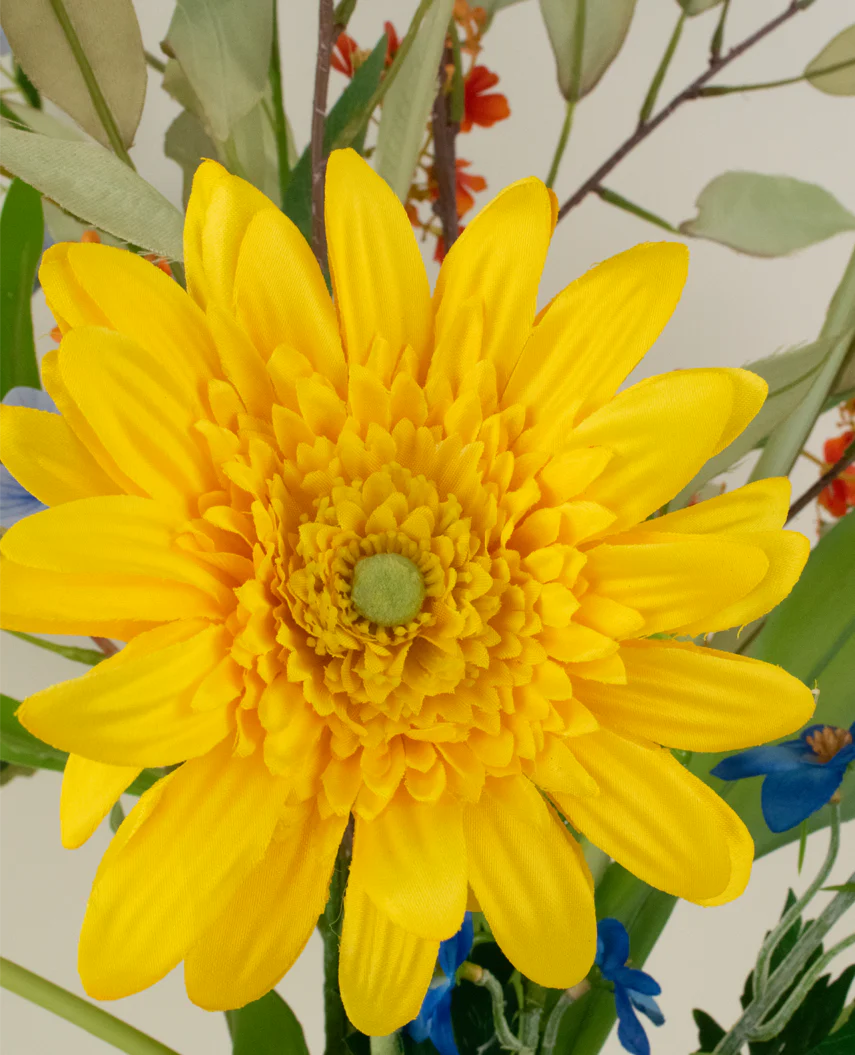 Bringen Sie eine frische und lebendige Atmosphäre in Ihr Zuhause mit Lemonade Garden, einem exklusiven Kunstblumenstrauß aus hochwertigen Seidenblumen. Mit einer Höhe von 95 cm vereint dieses luxuriöse Arrangement die farbenfrohe Schönheit und eleganten Formen von Gerbera, Delphinium, französischer Tulpe, Amaryllis und Dahlie, perfekt für ein stilvolles und zeitloses Interieur.