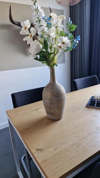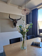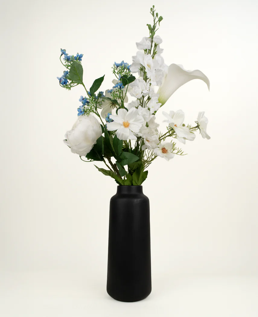 Die echten Touch -Lilien fügen eine majestätische Eleganz hinzu, während die wilde blaue Hortensie einen bezaubernden Farbknopf bietet, der die gesamte Tiefe verleiht. Zusammen erzeugen diese künstlichen Blumen ein harmonisches Stück von Weichheit, Licht und Verfeinerung.