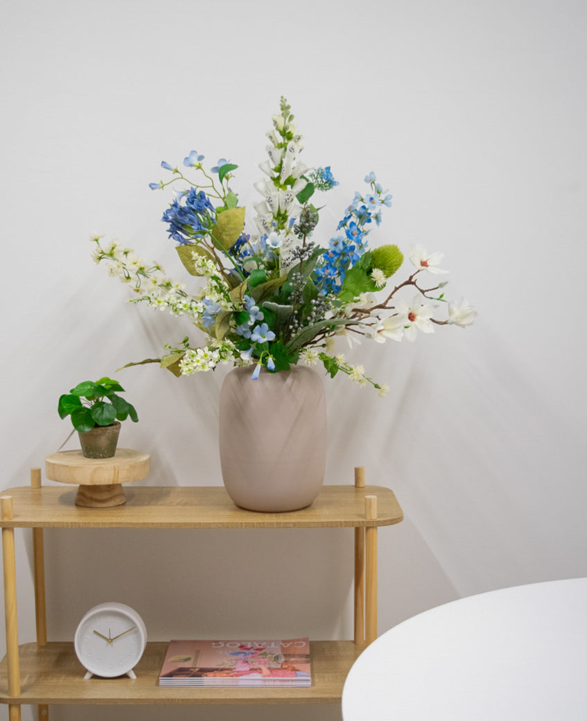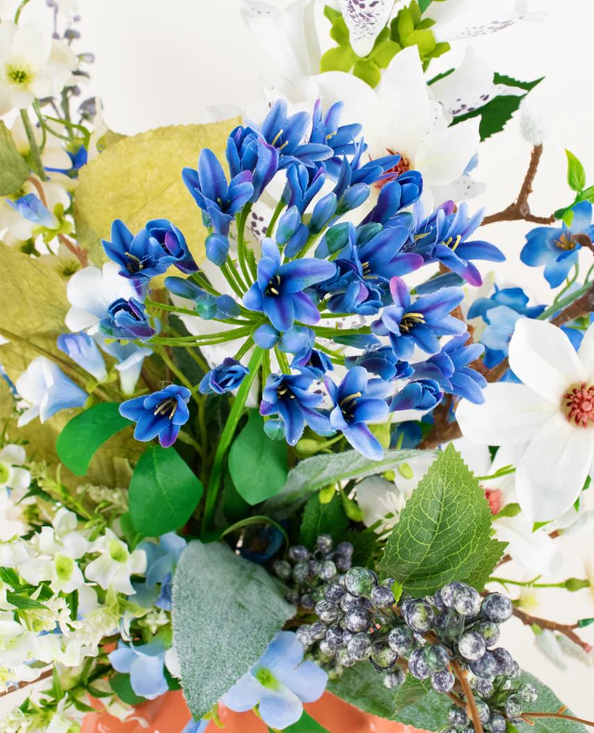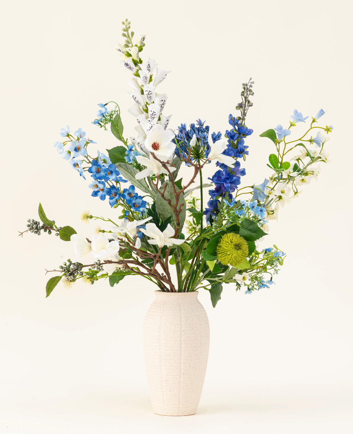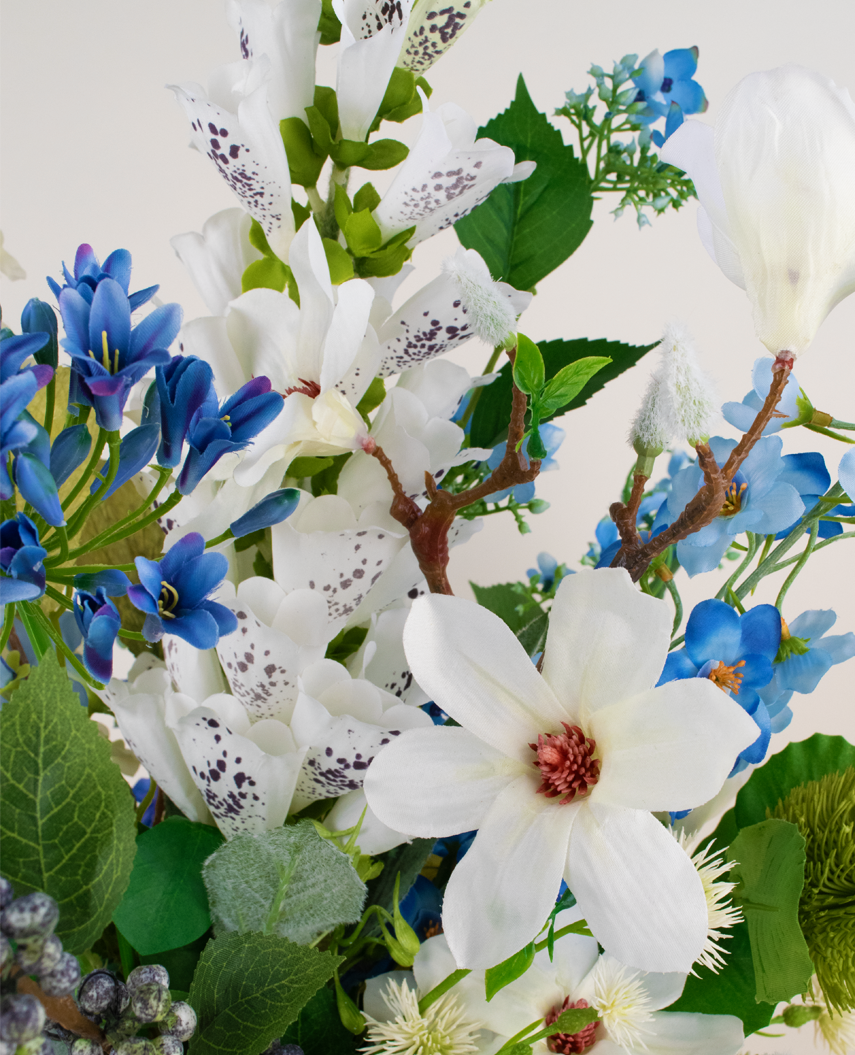 Lassen Sie sich von der raffinierten Schönheit des Kunstlicher blumenstraußes Cool Breeze 80 cm verzaubern. Dieses stilvolle Arrangement kombiniert sanfte Blautöne mit frischen weißen Akzenten und luxuriösem Grün, wodurch es eine ruhige und moderne Ausstrahlung erhält. Die sorgfältig gestalteten Kunstblumen und Blätter bringen einen Hauch natürlicher Eleganz in jeden Raum, ohne dass Sie sich um die Pflege kümmern müssen.