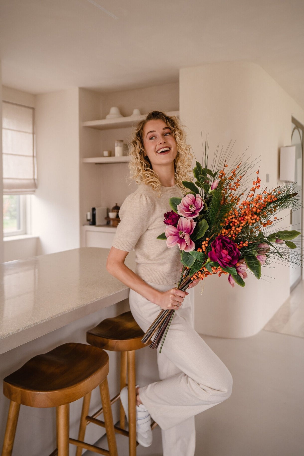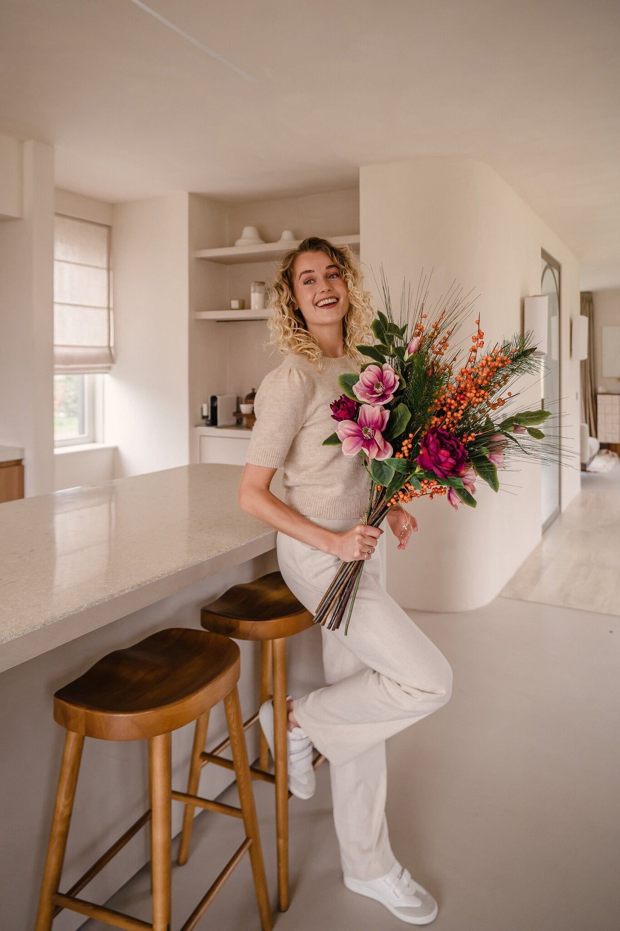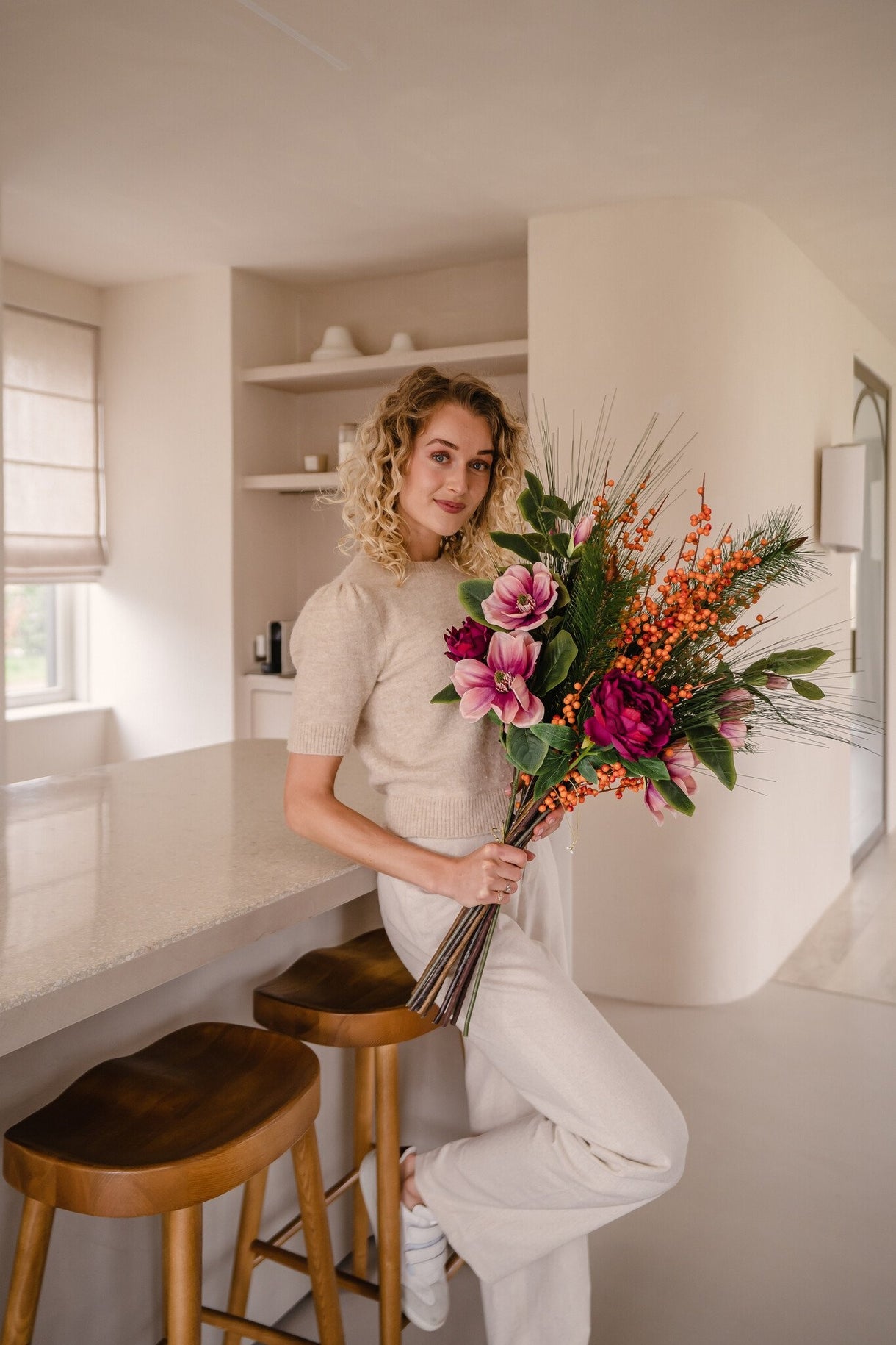 Gemütlichkeit das ganze Jahr über: Der künstliche Blumenstrauß Cozy Winter 88 cm ist die perfekte Lösung für alle, die die Wärme und Schönheit von Blumen genießen möchten, ohne sich um die Pflege kümmern zu müssen. Hergestellt von erfahrenen niederländischen Floristen, bietet dieser Strauß eine dauerhafte Alternative zu echten Blumen.